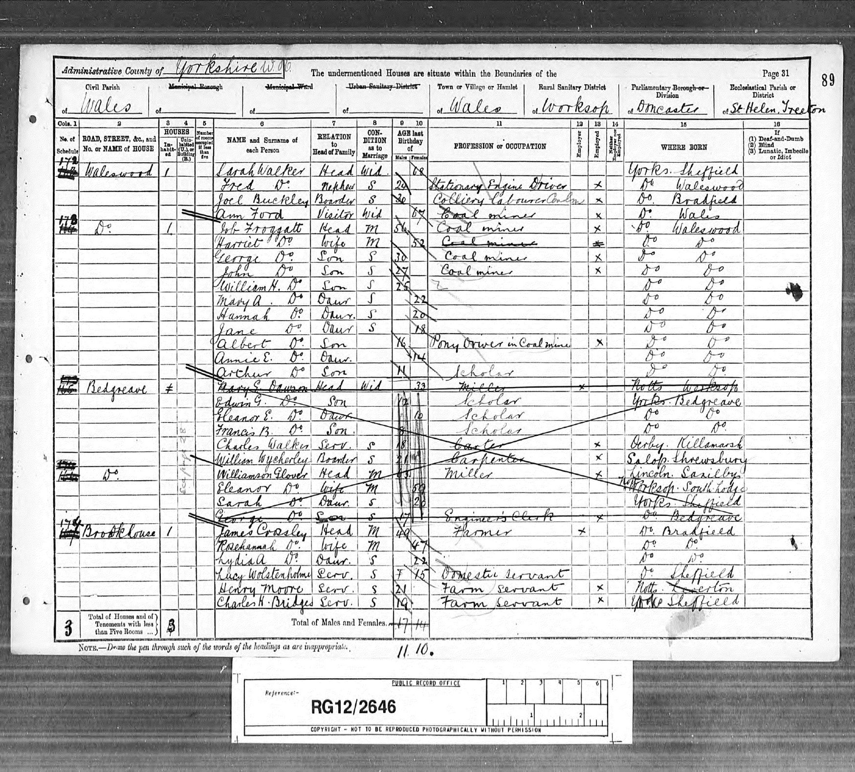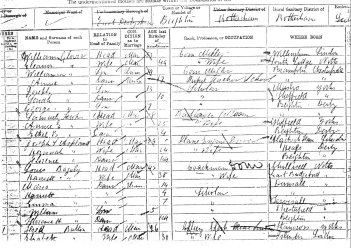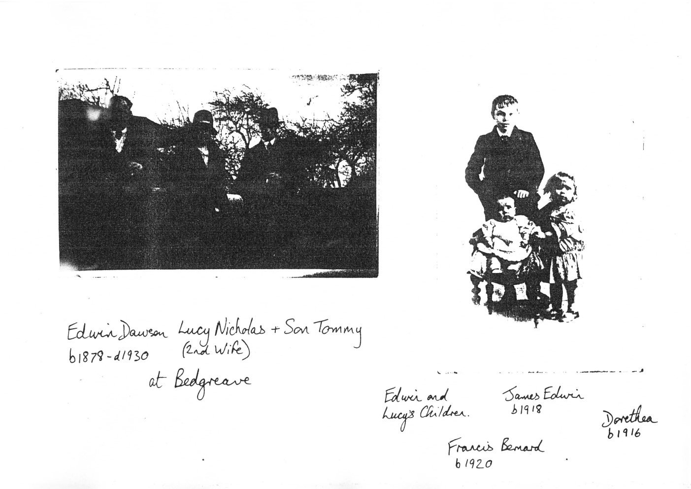 Mary Elizabeth Glover married to James Henry Dawson, of North Scarle and Eagle, on the Trent. They are recorded as corn millers at the 1881 census (see fig 8) - Bedgreave. James took on the mill when he returned from India with the army. The mill was still waterpowered. When Holbrook Pit took his water away they were forced to supply him with coal for a steam powered engine. At 32 years of age James died of a stroke when working in the mill. Mary and James had 3 children - Eleanor (Nellie) who married Mr Shaw from Winsford in Cheshire - they took their family back to Cheshire. Frank who bought Warsop Mill - his son Eric still runs the mill for feedstuffs. And Edwin (Ted) - miller at Bedgreave until his death in 1930. His first wife - Emily Wilson was a school teacher at Wales - She died 1912 leaving Ted with a 15 year old daughter Mary. Emily had been taking part in a church production, but was not released from work to practise. On the sound of the bell she ran from the school, cutting across the Vicarage garden. She tripped over a tent-peg and injured her left-arm. This was taken off by surgeons Graham Simpson and Garrick Wilson at Sheffield Royal Hospital. Emily died of Sarcoma Cancer. Mary (daughter) went to live with Aunt Julia and Charles Ashley in Wales. She visited the mill regularly and married Mr William Godfrey from Wales - his father was a hauler of coal. Mary K A. Godfrey still has many fond memories of Bedgreave Mill. Ted continued as miller - having many housekeepers to help with domestic chores. Later Ted married Mrs Nicholas the housekeeper. She had a son Tommy Nicholas. Ted and Lucy had two sons Bernard and Jim, and a daughter Dorris [Dorric? Dorrie?], who married Mr Reg Smith of Manor Farm - his brother had a farm on Jonny Cauldrells [?] Lane.