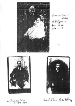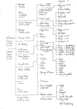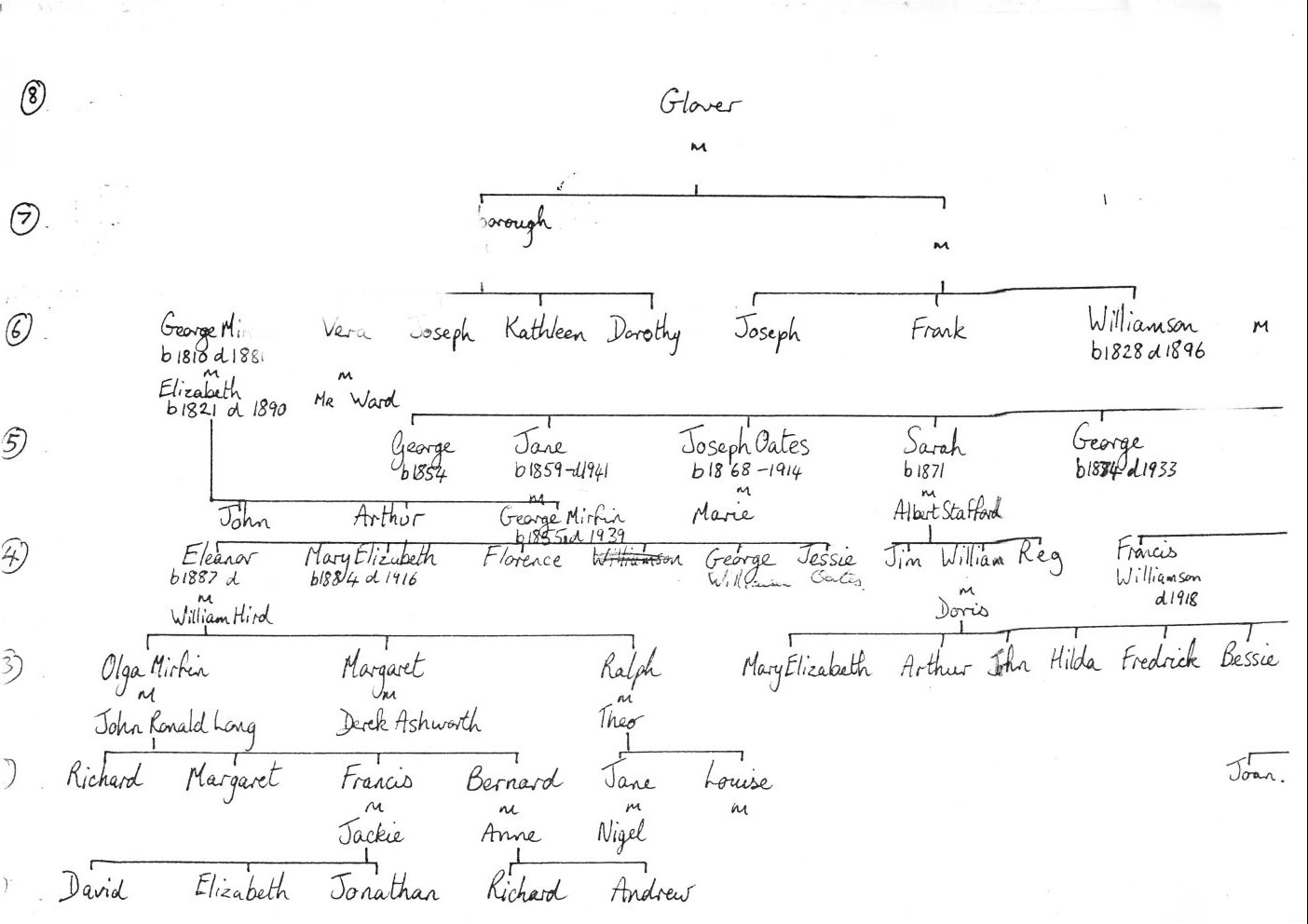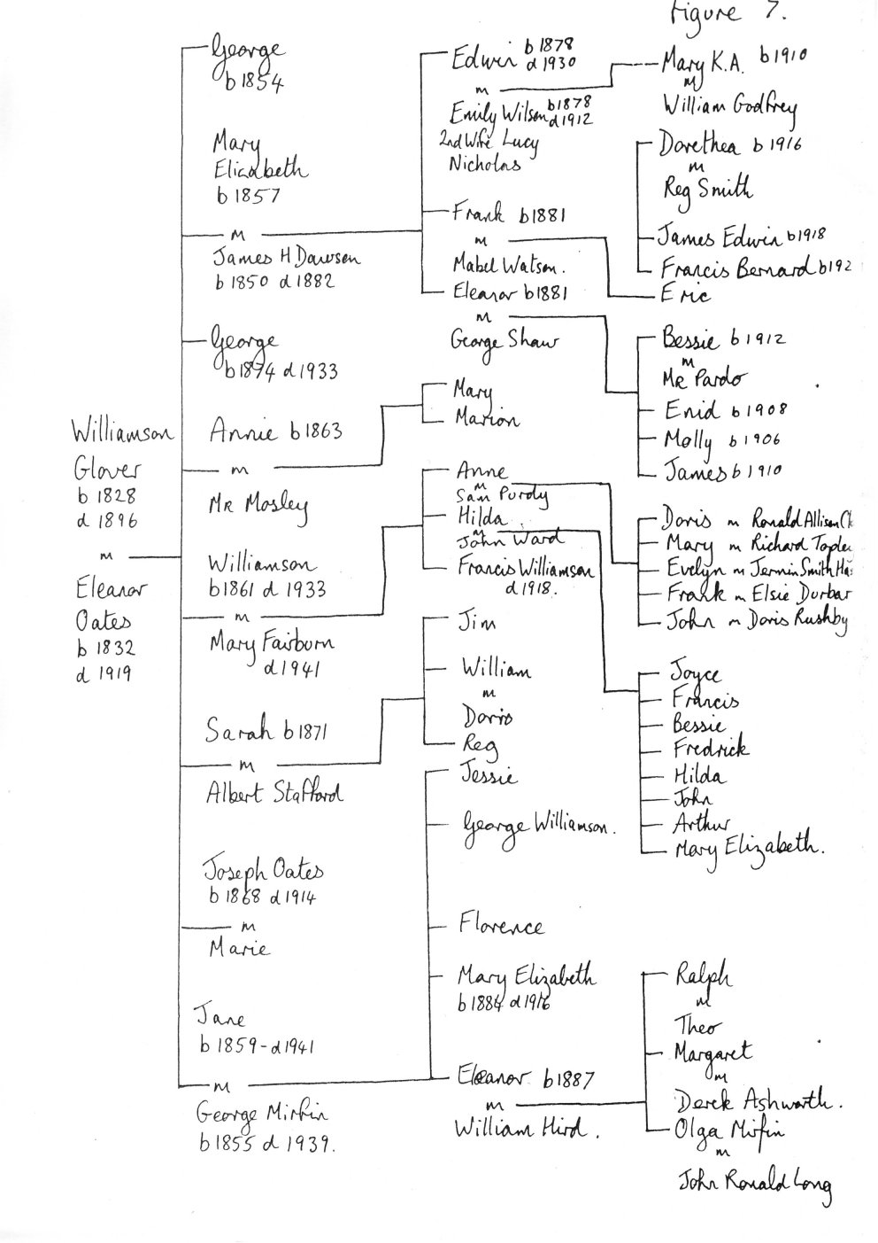 We can only dress the few facts we have on the area with the help of our imagination to develop a more complete picture of life before the NCB's open-cast activities. Memories of people connected with Bedgreave Mill help our imagination. One family - the Glovers, and their descendants have recorded some of the stories concerning characters and events relating to life around Bedgreave. The family tree shows how the characters and stories surrounding the Mill are linked (See fig 7).
