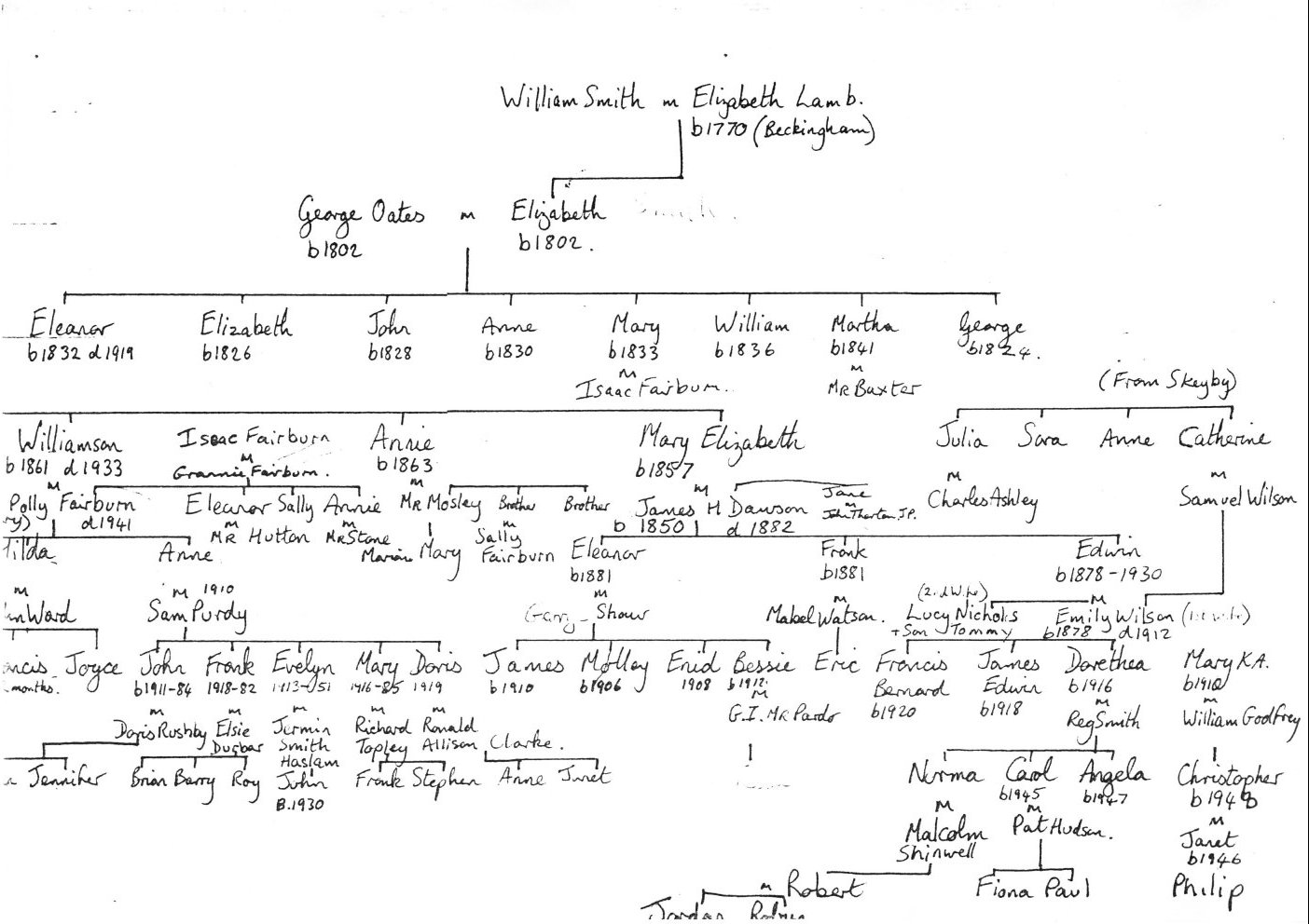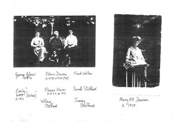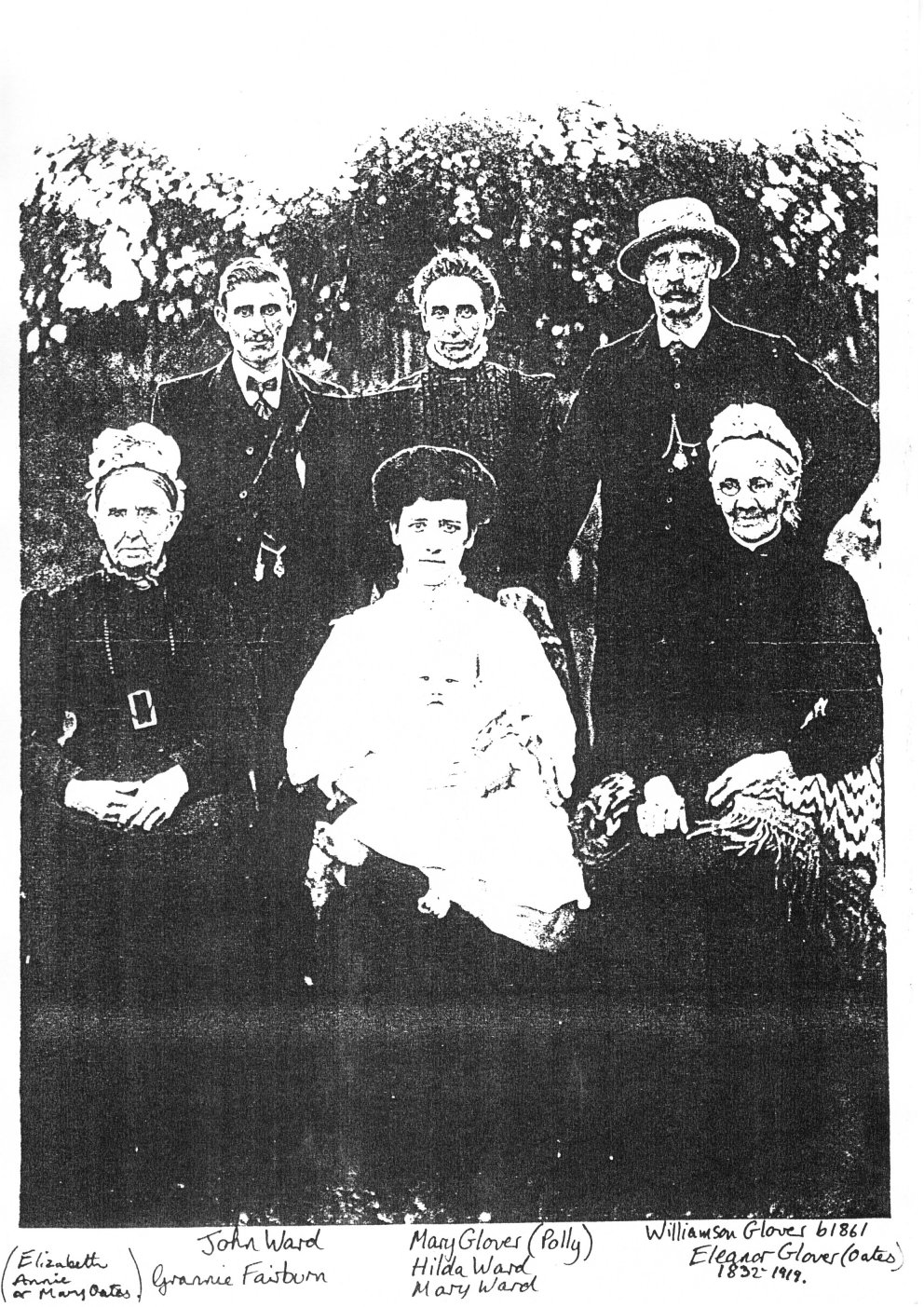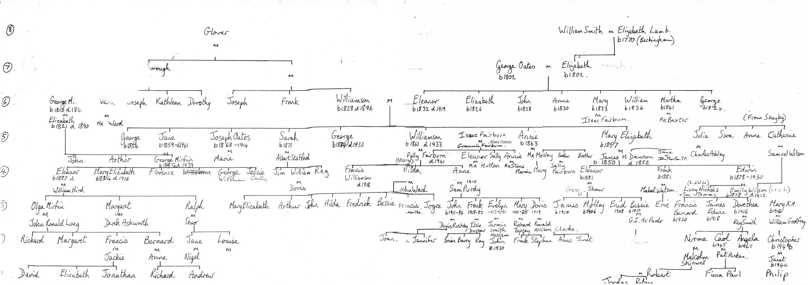 We can only dress the few facts we have on the area with the help of our imagination to develop a more complete picture of life before the NCB's open-cast activities. Memories of people connected with Bedgreave Mill help our imagination. One family - the Glovers, and their descendants have recorded some of the stories concerning characters and events relating to life around Bedgreave. The family tree shows how the characters and stories surrounding the Mill are linked (See fig 7).