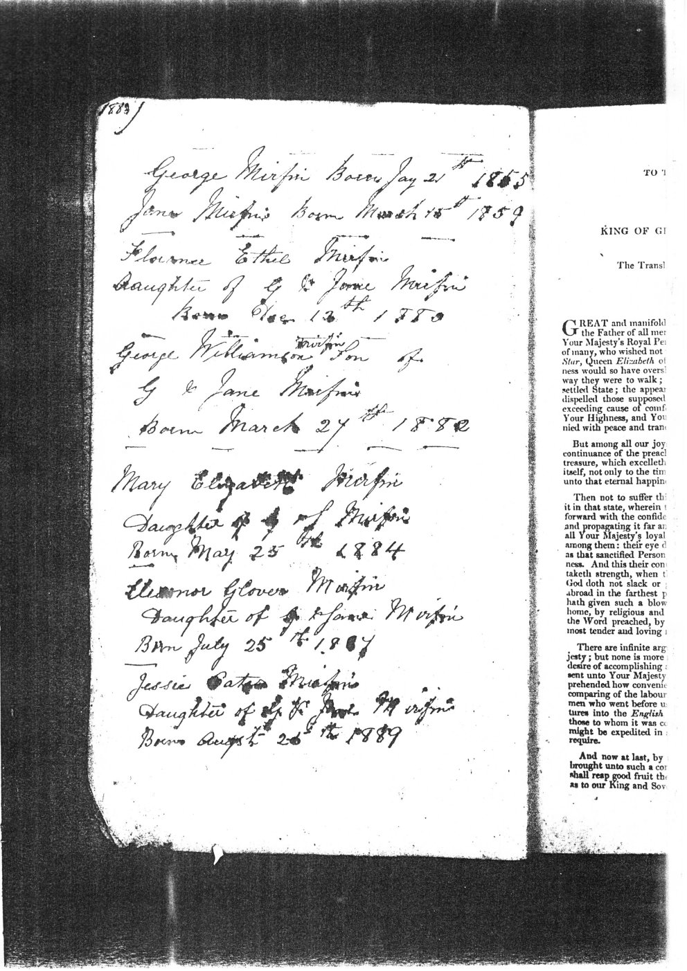 [Very faded image of handwritten family tree information on the Mirfins, much of it unreadable. ]