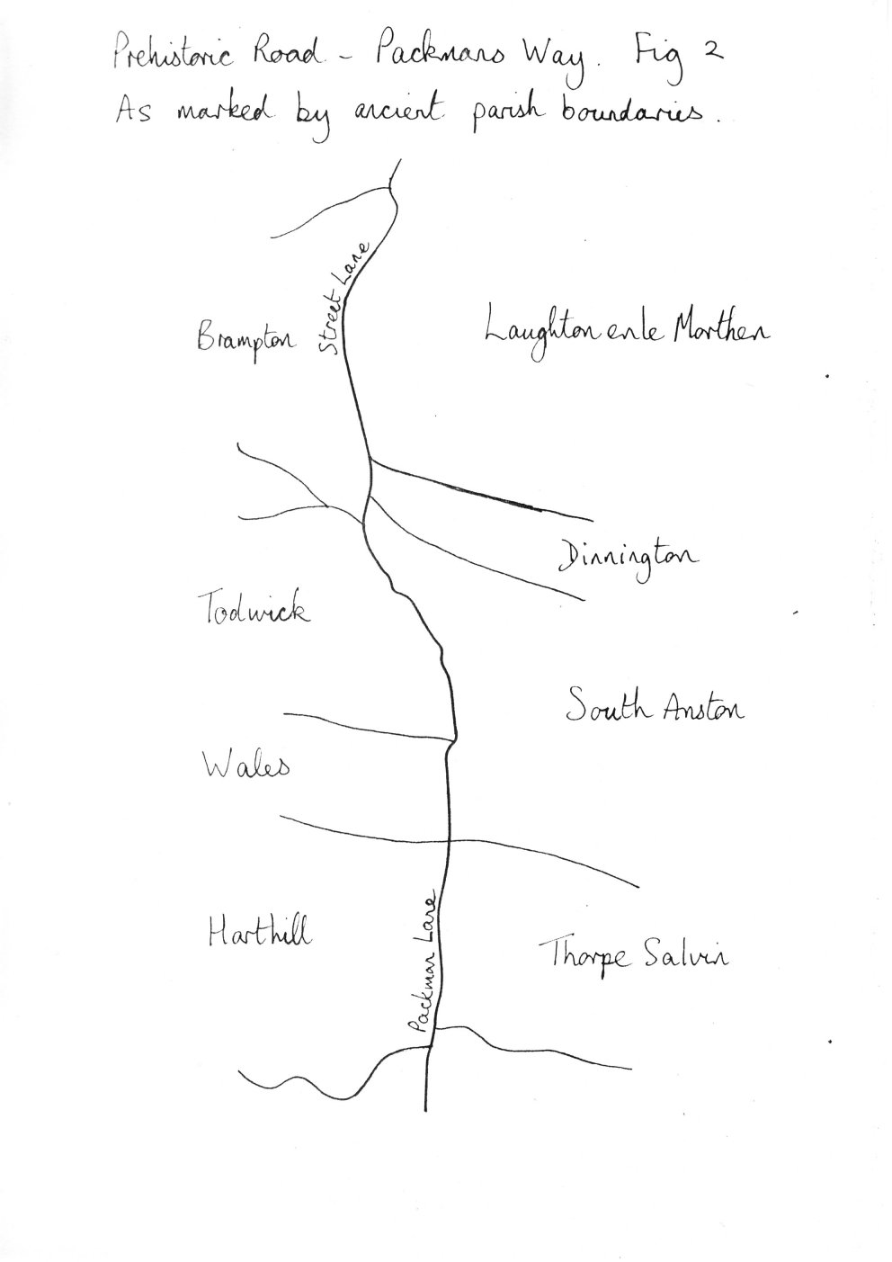 There is evidence of Roman occupation at Killamarsh. A ditched site at Kiveton has yielded pottery (from about 100 AD) together with a corn-drying kiln and the bones of domesticated animals. This site was alongside a Prehistoric Road - Packmans Way. This ancient road survives in part as country lanes heading north along the crest of the Magnesian Limestone as directly as the topography allows. The road has been adopted by the local parishes of Wales, Harthill and Thorpe Salvin as a parish boundary (see fig 2). Joseph Hunter (1828) described a minor road between Harthill and Thorpe Salvin as an old Roman Way called The Street. This is known as Packman Lane today. The Roman Road known as Ryknield Street passed through the area on its way from WallLichfield to Templeborough on the Don. It was of major military importance. Its alignment is fossilised by Pit Lane, Eckington, and a green lane from the Moss [Mass?] Brook, some 250 metres west of Eckington parish church. A projected line from here brings one to Street Fields, Mosborough. The road continues north-east to the north of Beighton railway station where sections of metalling were revealed in 1847 (Hunter 1869). This alignment, thought to continue through South Yorkshire to Templeborough, alternatively could be heading north-east towards the forts at Doncaster or even Rossington Bridge.