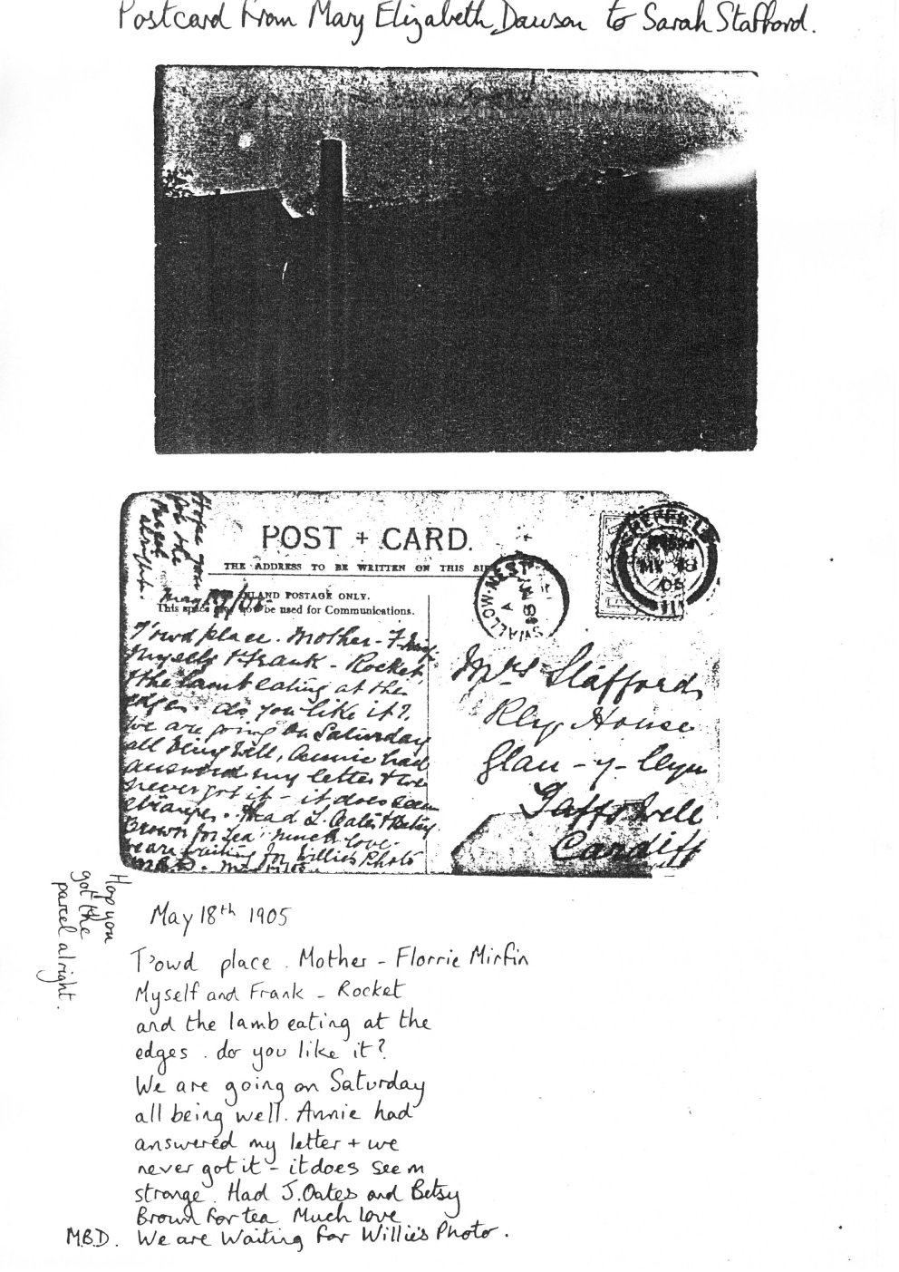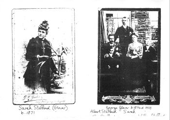 Sarah Glover (Aunt Sally) married Albert Stafford (Engineer). They met when he came to work on the iron bridge crossing the River Rother at Killamarsh. They lived in the red brick cottage at Bedgreave - with their 3 sons. The house was crammed with furniture and a piano. Albert played the violin. Jim was killed in the 14-18 war. When Sarah and Albert went to live in Bromsgrove with son Reg, William (Billy) and his wife Dorris lived in the cottage. Later they emmigrated to Australia. Sarah and Albert continued to travel the country - wherever his work took them (See fig 12). M E Dawson sent them a card showing the mill in 1905 - to Cardiff.