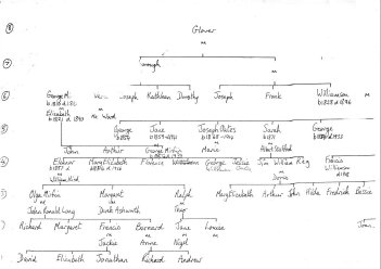 [Half of an extensive family tree diagram of the Glover family and relations. ]
