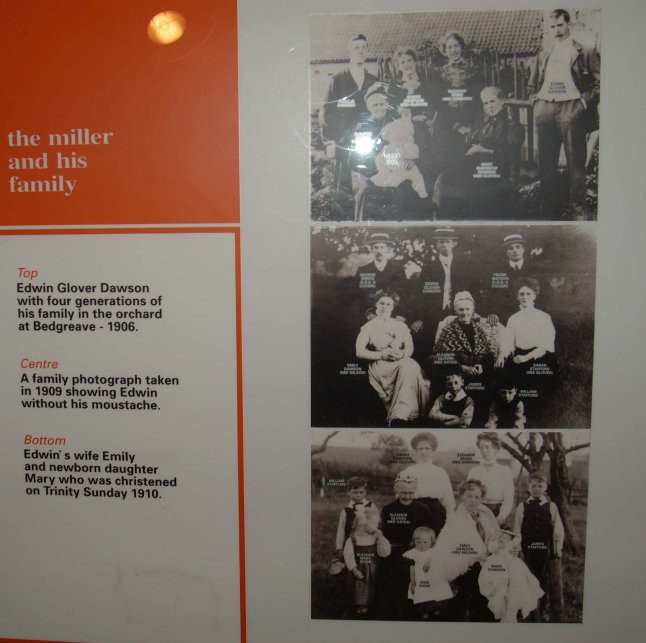 They had 8 children. Five were still at home - George Born 1854 had died. Son Williamson was also recorded as a Corn Miller at Beighton. Daughter Mary Elizabeth married James H Dawson of Bedgreave. When James died in 1882 the Glover family moved in with Mary E. to help run the mill - she had 3 children - twins Eleanor and Frank aged 1 and Edwin aged 4. Williamson died 1896 but Eleanor lived 37 years at the mill - a tall gentle old lady in a white lace cap and shawl - see collection of photos.