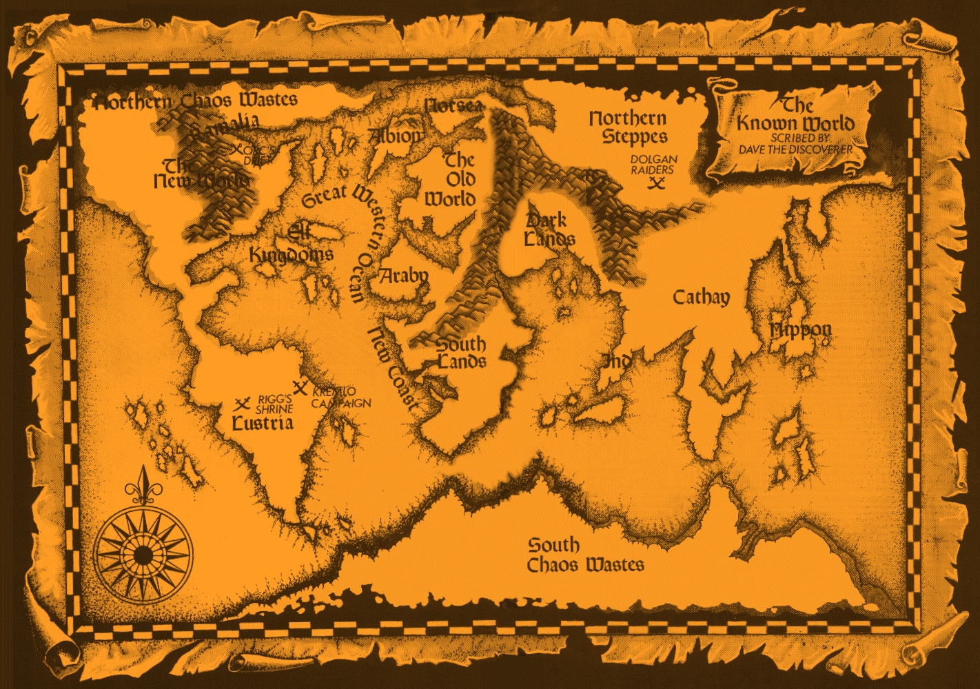 Relatively unexplored across the great ocean to the west of this land mass akin to Europe, you find the New World (North America). The elusive and aloof race of the Elves inhabit an ancient and jealously guarded island off the New World. On the New World itself dwells a sub-race of Elves legendary for their dark and bloodthirsty ways, and said to be at war with their island dwelling relatives. Cross the isthmus bridge from there into Lustria (South America) and you encounter dense jungle where, like the Southlands, a race of lizard-men (and, so some say, even frog-men) are rumoured to live. Stories also speak of humans making their home here and taking new shapes and cultures.